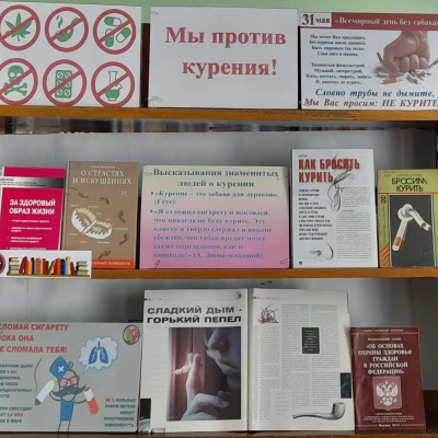 Представленные книги, журналы и статьи из периодических изданий, цитаты знаменитых людей предупреждают о негативном воздействии курения на здоровье человека, рассказывают о мерах, которые могут помочь в борьбе с распространением этой пагубной привычки.