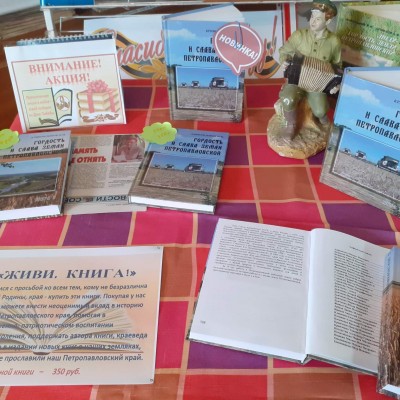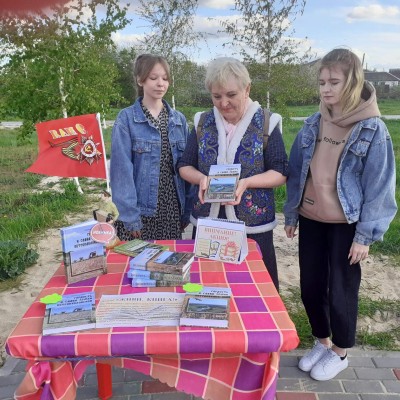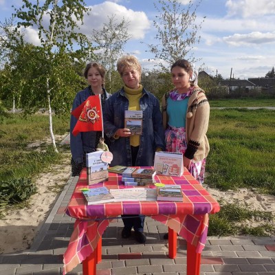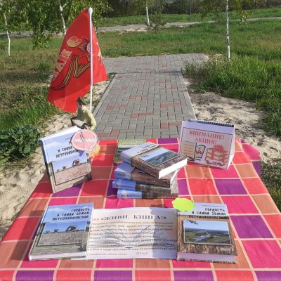 Акция#ЖИВИ,КНИГА! Патриотическая акция,посвященная творчеству местных писателей, проведенная в Петропавловской сельской библиотеке у выставки "Эту память у нас не отнять!", в сквере "Патриот".