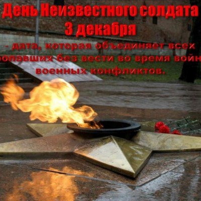 3 декабря в России отмечается памятная дата - День Неизвестного Солдата .Дата 3 декабря выбрана в связи с тем, что в этот день в 1966 году, в ознаменование 25-й годовщины разгрома немецких войск под Москвой, прах неизвестного солдата был торжественно захоронен у стен Московского Кремля в Александровском саду. Сегодня мемориал у Кремлевской стены стал символичным местом поклонения для всех тех, кто не знает, как погибли его родные и близкие, и где они погребены.
