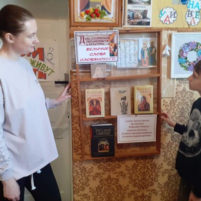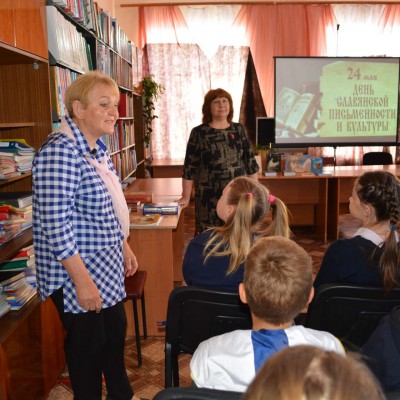 . Вначале культорганизатор Штондина Н.П. интересно и познавательно рассказала ребятам об истории возникновения праздника, провела беседу. Рассуждая о значении книг в жизни человека, вместе прочитали пословицы. Затем библиотекарь Руденко Т.П. познакомила ребят с книжной выставкой «Величие слова славянского», обратив особое внимание на издания, рассказывающие о житие святых братьев Мефодия и Кирилла. Продолжилось мероприятие экскурсией по библиотеке. Ребята посетили отдел «книгохранилище», ближе познакомились с творчеством знатоков русского языка и письменности: И. Тургеневым, А. Пушкиным, И. Буниным. Завершилось мероприятие общим мнением: «Кто много читает - тот много знает»