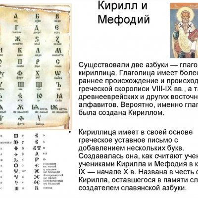 Были созданы две азбуки - глаголица и кириллица. Кроме того, братья-греки перевели на славянский язык Евангелие, Апостол и Псалтырь.
