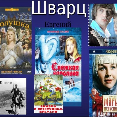 Сказки Евгения Шварца — творения, которые любят ребята всех возрастов, и эта любовь не угасает почти век. В них автор показывает жизнь простых девчонок и мальчишек в обычных ситуациях, но их мир детства удивителен. В нем есть место волшебству и необыкновенным происшествиям. Не верите, прочтите сказки Евгения Шварца : «Два брата», «Новые приключения Кота в сапогах», «Обыковенное чудо», «Дракон», «Рассеянный волшебник», «Сказка о потерянном времени», «Тень», «Голый король». А его стихи и рассказы охотно печатали все детские альманахи Ленинграда и журналы «Еж» и «Чиж», в которых он был постоянным сотрудником. Сначала Шварц писал книги, а вскоре – пьесы, среди которых переосмысление сказок знаменитого Андерсена: «Голый король», «Ундервуд», «Клад», «Красная шапочка», «Снежная королева», «Тень». Это были уже во многом шварцевские герои и сюжеты с его творческим чутьем и способностью дополнять чужие замыслы. Наиболее значимые его сценарии в кинематографе : «Золушка», «Первоклассница», «Марья-искусница», «Дон Кихот».