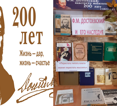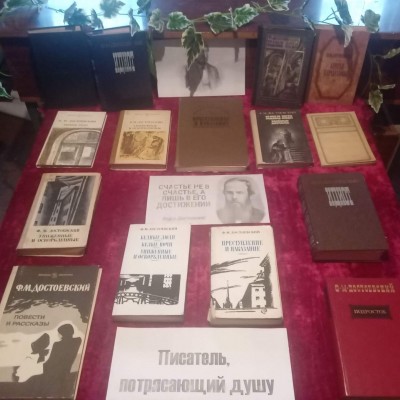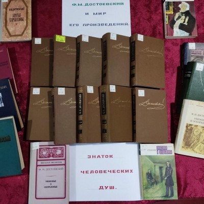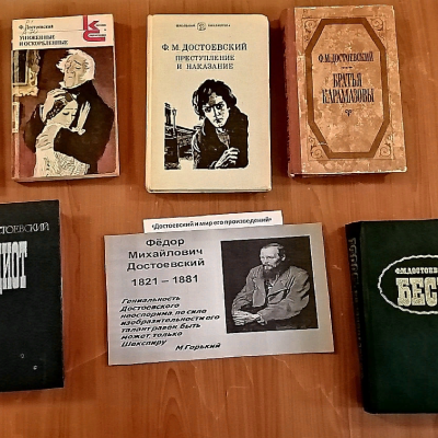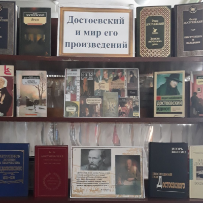 11 ноября ко Дню рождения Достоевского в межпоселенческой библиотеке оформлена книжная выставка «Достоевский и мир его произведений». Материал, представленный на выставке, познакомит с биографией писателя и поможет проследить как постепенно он развивает в своём творчестве взгляд на добро и зло, на человека, пребывающего в мире социальных и духовных противоречий, на драматический внутренний мир его героев. Вниманию читателей представлены книги из фонда библиотеки: «Преступление и наказание»- одно из самых «краеугольных» произведений русской и мировой литературы о вере, совести, грехе и искуплении через страдания.