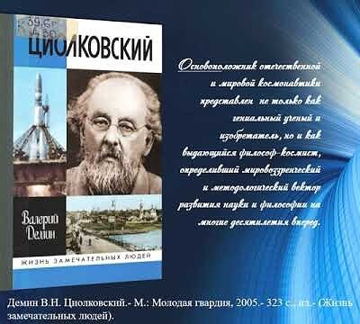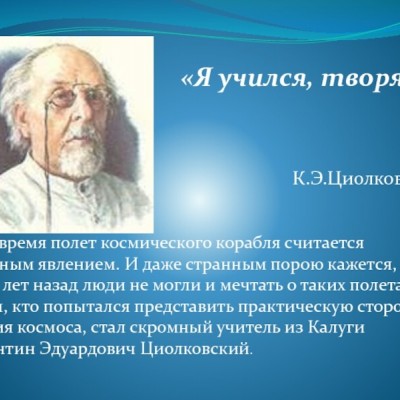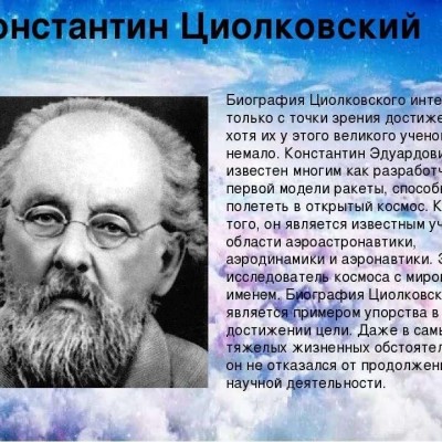 Константи́н Эдуа́рдович Циолко́вский (5 [17] сентября 1857, Ижевское, Рязанская губерния — 19 сентября 1935, Калуга) — русский и советский учёный-самоучка, разрабатывавший теоретические вопросы космонавтики, и мыслитель эзотерической ориентации, занимавшийся философскими проблемами освоения космоса.