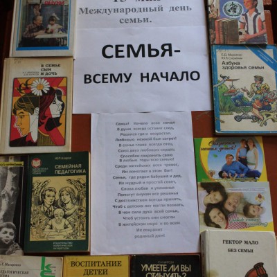 15 мая в России отмечается Международный день семьи, провозглашенный Генеральной Ассамблеей ООН в 1993 году. Учреждение этого дня было вызвано озабоченностью мирового сообщества современным положением семьи и ее значением в жизни общества и в воспитании подрастающего поколения. Именно этой значимой дате посвящена книжная выставка под названием «В КРУГУ СЕМЬИ». Книжная выставка направлена на читателя всех возрастов.Для взрослого посетителя библиотеки предложена классическая художественная литература о семье, таких знаменитых авторов литературного слова,как М.Шолохов-"Тихий дон,Т.Драйзер "Американская трагедия" ,К.Маккалоу "Поющие в терновнике", Даниэла Стил, и др.Так же на выставке есть литература и для младших посетителей - это стихи о семье и дружбе таких знаменитых писателей,как Е.Благинина и С.Маршак. Все эти и другие произведения можно найти на нашей книжной выставке.