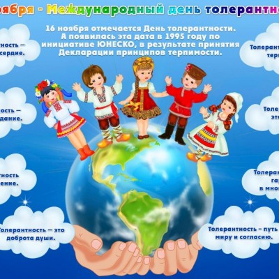 16 ноября, в России отмечается День толерантности. Этот праздник отмечают более чем в ста странах мира. Каждая страна особенная и жители тоже особенные. Мы разные, совсем не похожие друг на друга. У нас разный цвет кожи, мы говорим на разных языках, у нас разные обычаи и традиции. Но все мы едины в одном – мы люди. Люди на свет рождаются разными: непохожими, своеобразными.