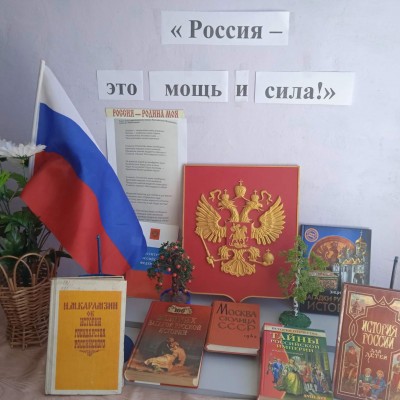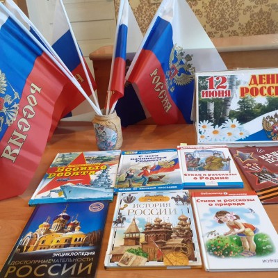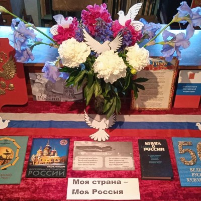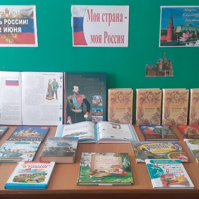 В библиотеке оформлена книжная выставка ко Дню России: "Моя страна - Моя Россия". На выставке представлены книга о России, о 100 Великих побед России, о достопримечательностях России, о великих русских художниках, история России и книга, под названием " Как ты хороша, Родина моя! "