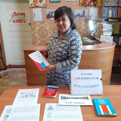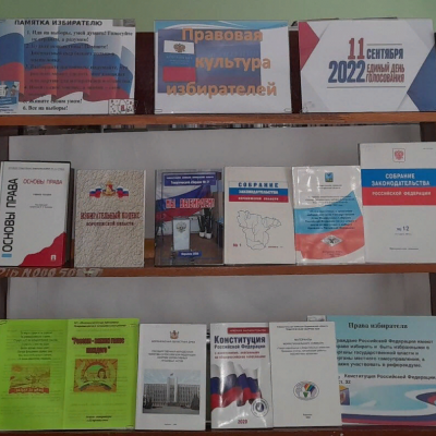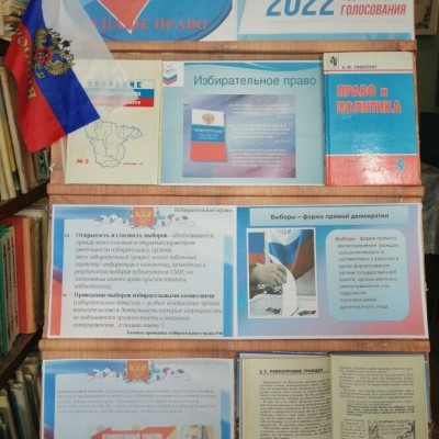 В библиотеке оформлена книжная выставка «Правовая культура избирателей» с целью путешествия в мир политики, права и выборов. С помощью книг и дополнительных материалов можно будет узнать историю возникновения избирательного права , познакомиться с политической жизнью общества, проследить этапы становления демократии в нашей стране. Выставка призвана активизировать гражданскую позицию, убедить всех в необходимости выполнять свой гражданский долг, голосуя на выборах.