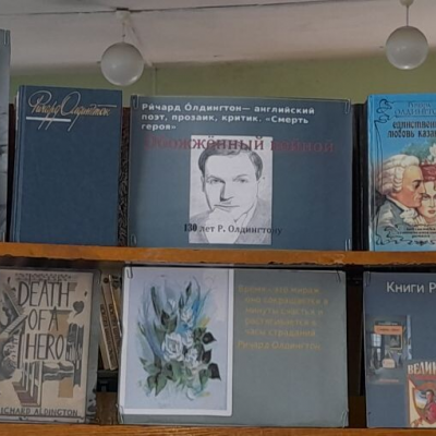 На книжной выставке прозаика, поэта, литературоведа, критика представлены книги – «Смерть героя», «Единственная любовь Казановы» и другие. Представлена и литература о жизни и творчестве Р. Олдингтона. Р. Олдингтон – плодовитый писатель широкого диапазона. В сборнике рассказов «Дорога к славе» он удачно продолжил антивоенную тему, столь блестяще начатую в «Смерти героя». Достаточно вспомнить его великолепные новеллы «Убит в бою», «Ловушка», «Жертвенный пост», «Не в своем уме» и другие. Р. Олдингтон удачно выступал как сатирик. Например, в романе «Сущий рай» (1937). Он достойно продолжал литературные традиции Ч. Диккенса и В.М. Теккерея.