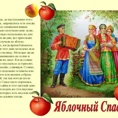 История праздника Яблочный Спас На Руси праздновать Яблочный Спас начали очень давно. Как и другие августовские праздники приурочен он к сбору урожая. В народе Спас был одним из самых почитаемых праздников, а дату, на которую он выпадал, связывали с наступлением осени. После крещения Руси праздник обрел новую силу, потому что в этот день Православная церковь отмечает великий двунадесятый праздник Преображение Господне. Нынешний Спас вобрал в себя элементы христианства и язычества, различные народные и церковные традиции. Яблочный Спас: традиции праздника и его обычаи По традиции, на Преображение Господне в церквях в конце Божественной литургии освящают яблоки и другие плоды. По этой причине в народе и назвали этот праздник Вторым, или яблочным, Спасом. Кое-где, видимо под влиянием священного писания, праздник именуется «Спас на горе». В этот день наши предки отмечали Осенины – встречу осени. Вечером всей деревней отправлялись в поле и с песнями провожали закат солнца. Считалось, что на Преображение начинает преображаться природа – к ночи становится холодно, а днём уже не так сильно припекает солнце, постепенно начинает желтеть листва, первые стаи журавлей отлетают на юг. В это время наблюдается начало перелета лебедей, что является предзнаменованием скорого наступления холодов: «Лебедь на хвосте несёт зиму». С раннего утра на паперти церквей выставлялись столы, на которых громоздились горы яблок, картофеля, гороха, репы и брюквы, стояли посудины с зерном ячменя и ржи. После обедни священник благословлял плоды нового урожая, а прихожане всего понемногу ссыпали в специальные корзинки – в пользу причта. Потом, перекрестясь, разговлялись яблоками. Священник передавал яблоки детям, нищим и тем людям, у которых не было своих садов. Вернувшись из храма, крестьяне приступали к сбору яблок (кроме поздних сортов). Владельцы больших садов, составляющих значительную часть сельскохозяйственных угодий, перед сбором урожая приглашали к себе священника. В саду под деревьями ставили икону Преображения Господня и служили благодарственный молебен, после чего приступали к снятию яблок. Садоводы спешили собрать как можно больше фрукты, потому что верили – собранные в этот день плоды лучше выглядят и дольше сохранятся. К тому же впереди крестьян ждало много работы – уборка других фруктов и овощей, жатва ярового хлеба, посев озимых. Всё это нужно успеть до наступления осенних ненастных дней. Не случайно в народе говорили: «После Второго Спаса дождь – хлебогной». В некоторых деревнях на Преображение Господня организовывали так называемые столованья. На площади перед храмом ставили длинный ряд столов, хозяйки выносили всевозможную снедь, прежде всего ватрушки и пироги с яблочной начинкой, яблочный квас, отчего вся окрестность наполнялась ароматом выпечки и свежих яблок. У этих столов собирался народ, пробуя угощения и нахваливая хозяек. Существовало поверье, что на том свете детям, чьи родители до Второго Спаса не ели яблок нового урожая, раздают яблочки. Поэтому взрослые, особенно те, у кого умирали дети, считали за большой грех кушать яблоки до Преображения. Время после Второго Спаса считалось самым удачным для посева озимых, особенно если погода тому благоприятствует. Сеять рожь старались при северном ветре, тогда, по народным наблюд