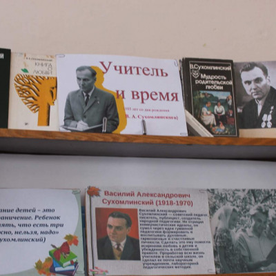 Книжная выставка посвящена 105- летию со дня рождения Василия Александровича Сухомлинского- русского- педагога –новатора, писателя. Здесь представлены, помимо художественных, интересные книги по психологии семейных отношений, хрестоматийные сборники с произведениями универсального характера о взаимоотношениях между родителями и детьми.