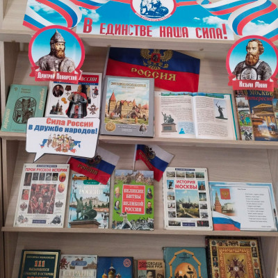 На выставке представлены книги, посвященные истории нашей страны, событиям 1612 года, когда воины народного ополчения под предводительством Минина и Пожарского освободили Москву от польских интервентов, проявив героизм, беззаветную преданность Родине и сплоченность, а так же литература, представленная на данной экспозиции, поможет узнать немало нового и интересного о нашей стране: от климата и географического положения до достопримечательностей отдельных городов и обычаев проживающих в России народов. Здесь представлены и энциклопедии, повествующие об истории нашей страны, а главное – о давней, четырехсотлетней истории самого Дня народного единства, об освобождении Москвы от польских интервентов силами народного ополчения. Выставка пользуется спросом как у взрослых, так и детей.