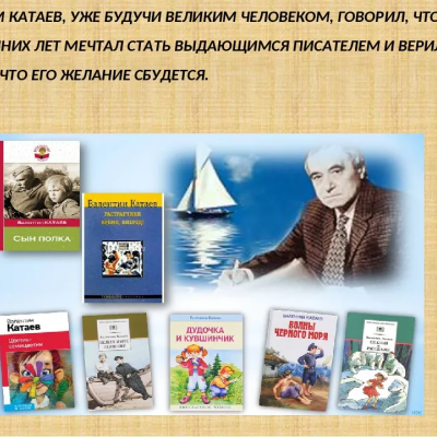 Советский писатель Валентин Петрович Катаев прожил долгую, насыщенную событиями жизнь. Этого человека отличало сочетание невероятной отваги, порядочности, доброты и разностороннего таланта. На его глазах свершались многие важные исторические события, он – участник трех войн – Первой мировой, Гражданской и Великой Отечественной. Эти вехи нашли отражением в его творчестве: рассказах и повестях, пьесах, стихах и очерках. Его работы взяты за основу многих сценариев к художественным и мультипликационным фильмам, к постановкам театральных пьес.
