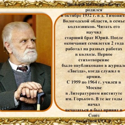 Белов Василий Иванович (1932–2012) — советский писатель, поэт и сценарист. Один из ярких представителей «деревенской прозы», чьё творчество отличается простотой и натуралистичностью. Василий Белов, биография которого будет особенно полезна при изучении литературы в 3 классе, стремился к тому, чтобы донести до читателя всю красоту и многообразие русского языка.
