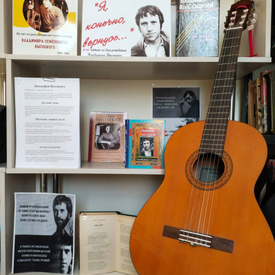 На выставке в библиотеке представлены книги стихов, песен, а также рассказы о жизни и творчестве Владимира Высоцкого.