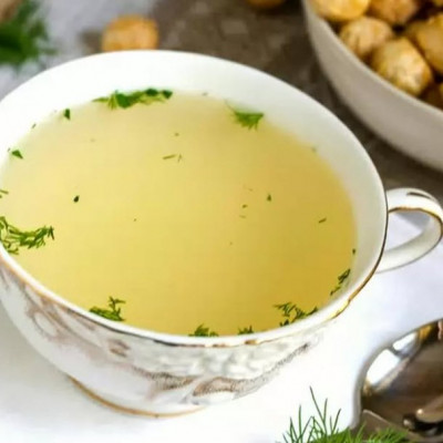 Чтобъ прiготовить хорошiй крѣпкiй бульонъ, рассчитывается обыкновѣнно на каждаго человѣка 1/2 фунта говядинъ. Говядину отдѣляютъ от костѣй, рѣжутъ кусками, кладутъ въ кастрюлю и туда же помѣщаютъ кости и солятъ по вкусу; всё наливаютъ холодной водой, чтобъ покрыло говядину, кастрюлю закрываютъ крышкой и хорошо уварiваютъ на мѣдлѣнномъ огнѣ. Когда говядина сдѣлается такъ мягка, что свободно можѣтъ щипаться пальцами на мѣлкiя куски, тогда говядину вытаскиваютъ, но кости оставляютъ, доливаютъ опять столько водъ, сколько её убавилось, кладутъ по 1 штъ. разныхъ корѣньевъ и продолжаютъ кипятить. Надо помнiть разъ навсѣгда, что когда бульонъ начинаетъ кипѣть, то всѣгда образуется накипь, т.е. пѣна, которую слѣдуетъ постоянно снiмать. Это замѣчанiя относится какъ къ бульонамъ, такъ равно и ко всѣмъ жидкимъ блюдамъ, въ которыхъ входитъ мясо какихъ бы то ни было тѣплокровныхъ животныхъ. Дальше, когда корѣнья уварiлись, бульонъ процѣживаютъ черѣзъ салфетку, и прiготовлѣнный такимъ образомъ бульонъ очень вкусѣнъ и питатѣлѣнъ. Если бульонъ будѣтъ не очень прозраченъ, то аго очищаютъ яйцомъ, для чаго поступаютъ такъ: когда бульонъ процѣжѣнъ, то на каждый фунтъ взятой говядинъ бѣрутъ 1 яйцо, которое хорошо размѣшиваютъ съ охладившимъ до тѣмпѣратуръ парнаго молока бульономъ, потомъ бульонъ ставятъ опять на плиту и, постоянно мѣшыя даютъ ему хорошо вскипѣть раза два и вторiчно процѣживаютъ чрѣзъ салфетку.